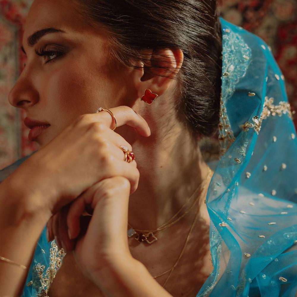 A gold Earrings, adorned with a distinctive pendant with an Agate stone, which is distinguished by its bright red color. The design is inspired by the beauty of intricate Islamic art, especially the Kiswa of the Holy Kaaba. It tells a story of art, spirituality and tranquilit