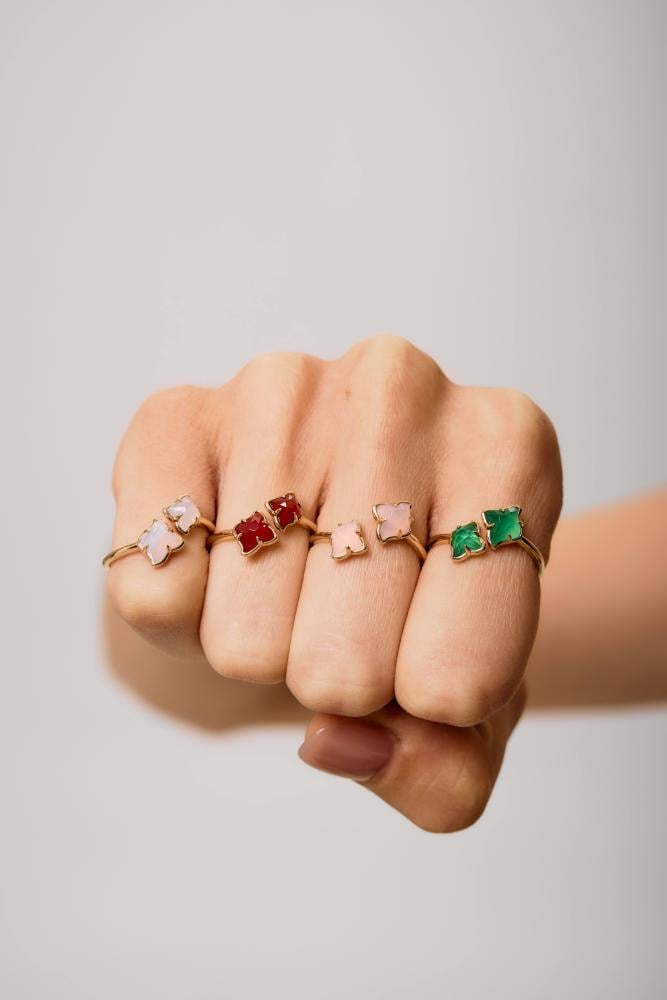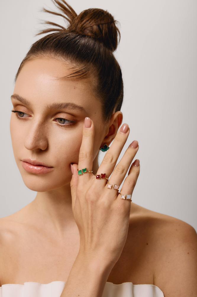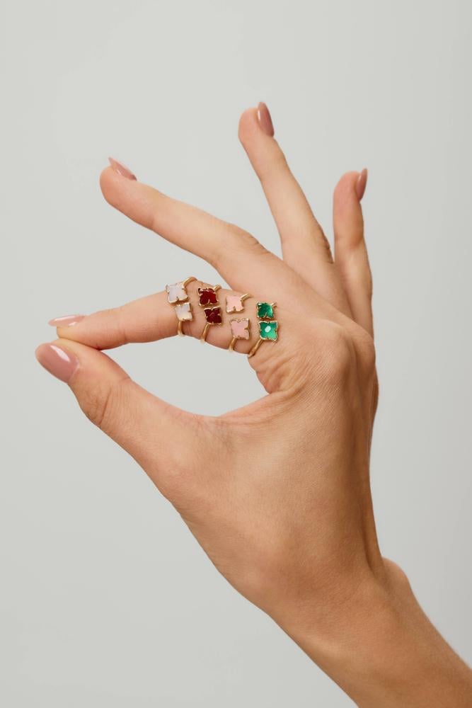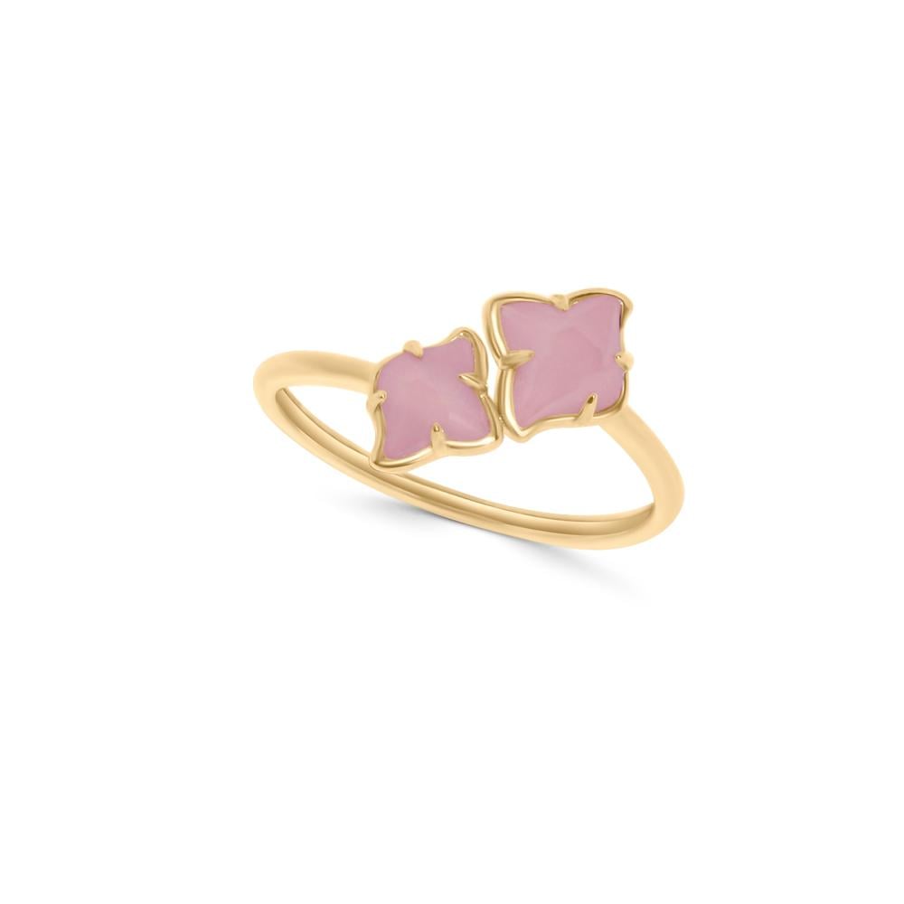 A golden ring, adorned with a Rose Quartz stone, which is distinguished by its bright Rose color. The design is inspired by the beauty of intricate Islamic art, especially the Kiswa of the Holy Kaaba. It tells a story of art, spirituality and tranquility